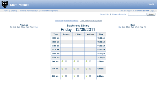 A booking system that staff can use to manage public computer bookings. Access to public computers with pcbooker client software can be regulated via the intranet . There is also a public web interface for patrons to make future bookings.