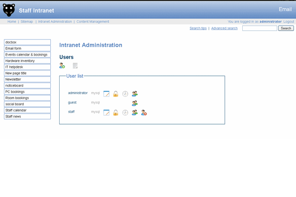 • Content management system allows the delegation of content editing by the intranet administrator. Content editors can create pages, add Images and documents can be uploaded.