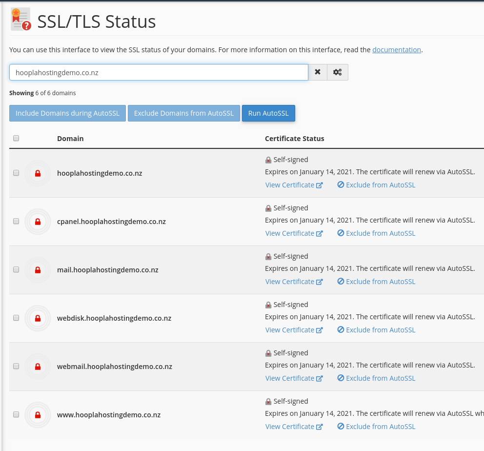 Once complete all padlocks will show green. If you have a domain which isn't hosted within your cPanel account you can exclude it from AutoSSL.