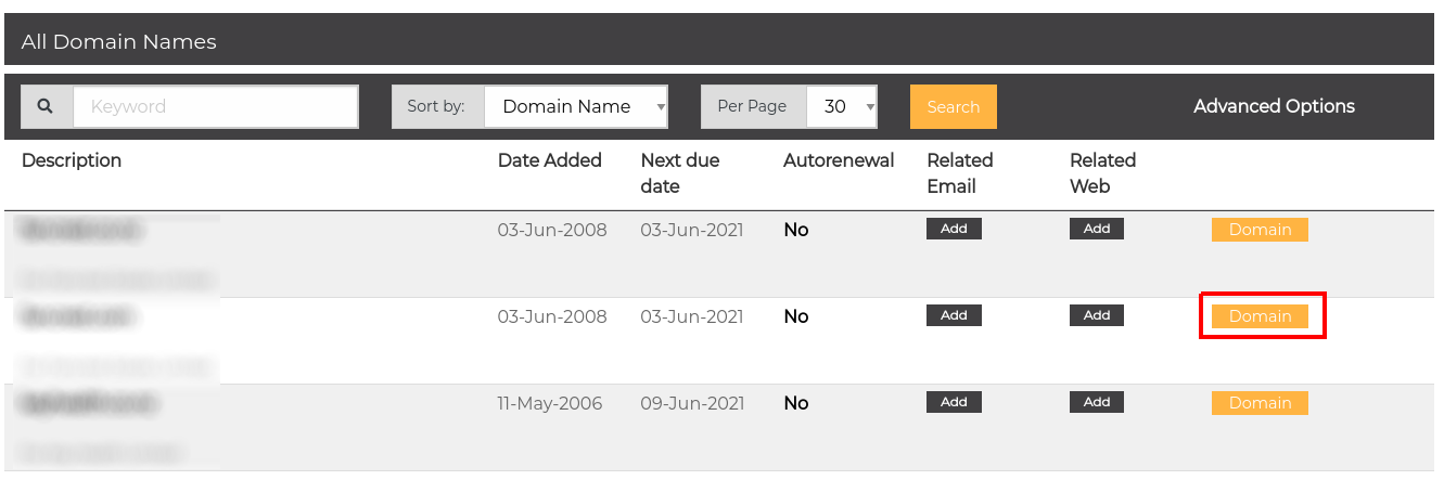 - Find the domain you with to request the UDAI/EPP code for and click Domain