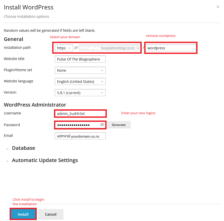 Take note of /wordpress - Remove it to if you do not want wordpress in a folder. E.g www.yourdomain.co.nz/wordpress
