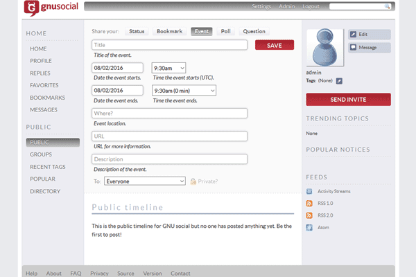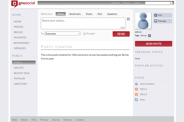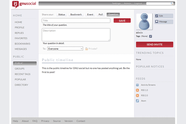 • GNU social is a free social networking platform. It helps people in a community, company or group to exchange short status updates, do polls, announce events, or other social activities (and you can add more!). Users can choose which people to "follow" and receive only their friends'or colleagues' status messages. It provides a similar service to sites like Twitter, Google+ or Facebook, but is much more awesome.