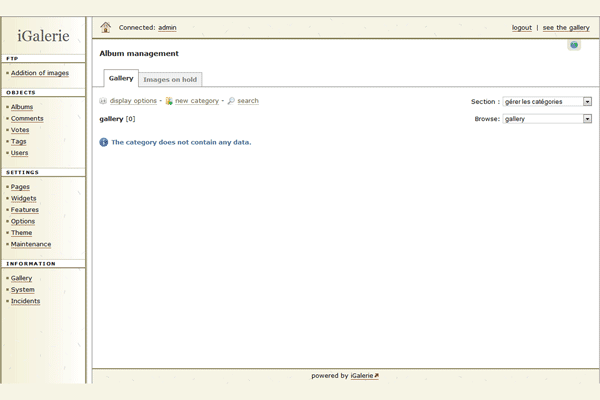 With iGalerie, adjustments are made via an ergonomic and user-friendly administration interface clear,. All functions can be activated by a mouse click, allowing you to create a minimalist gallery as a very complete gallery. And thanks to the contextual and full documentation online help, you'll never get lost!