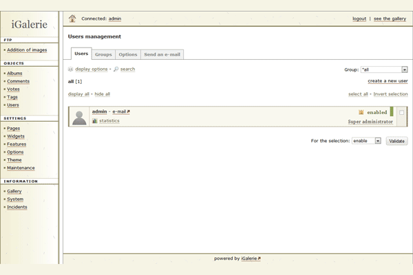 iGalerie allows your visitors to sign up, send their images or become a director. You have complete and advanced management of all your users: system groups with many permissions, several methods for validating entries, customizable profile information, avatars, email notifications ...