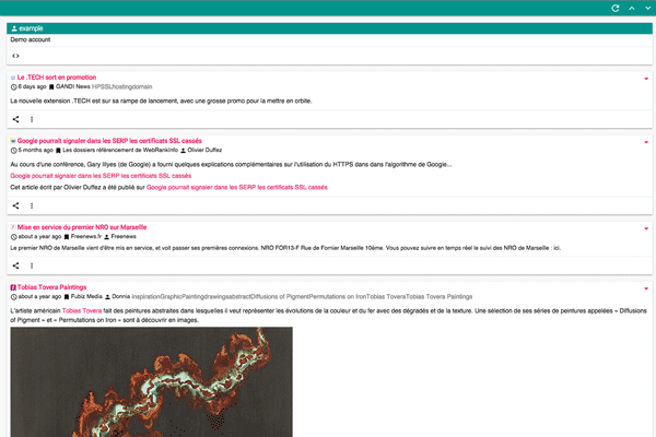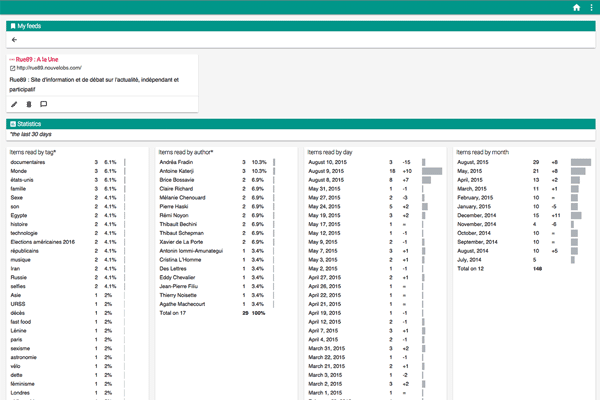 • Global statistics and statistics by subscription and by folder (activity by tag, by folder, by day, by month, by time of day, by day of the week...)