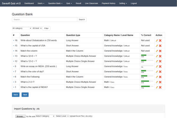Add question manually or Import questions from MS excel(.xls) and MS word(.docx) file.