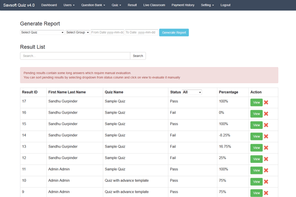 Administrator can generate CSV report of results by selecting group , quiz name and date range. Option to generate PDF certificate.