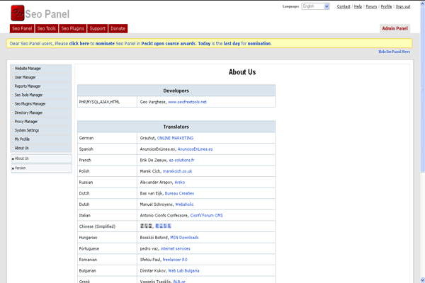 Seo panel can be used in multi languages and user can set their native language for thier session. Currently seo panel support 17 languages English, French, German, Polish, Italian, Romanian, Russian, Spanish, Dutch, Portuguese, Bulgarian, Hungarian, Chinese(traditional and simplified), Greek, Persian and Turkish .